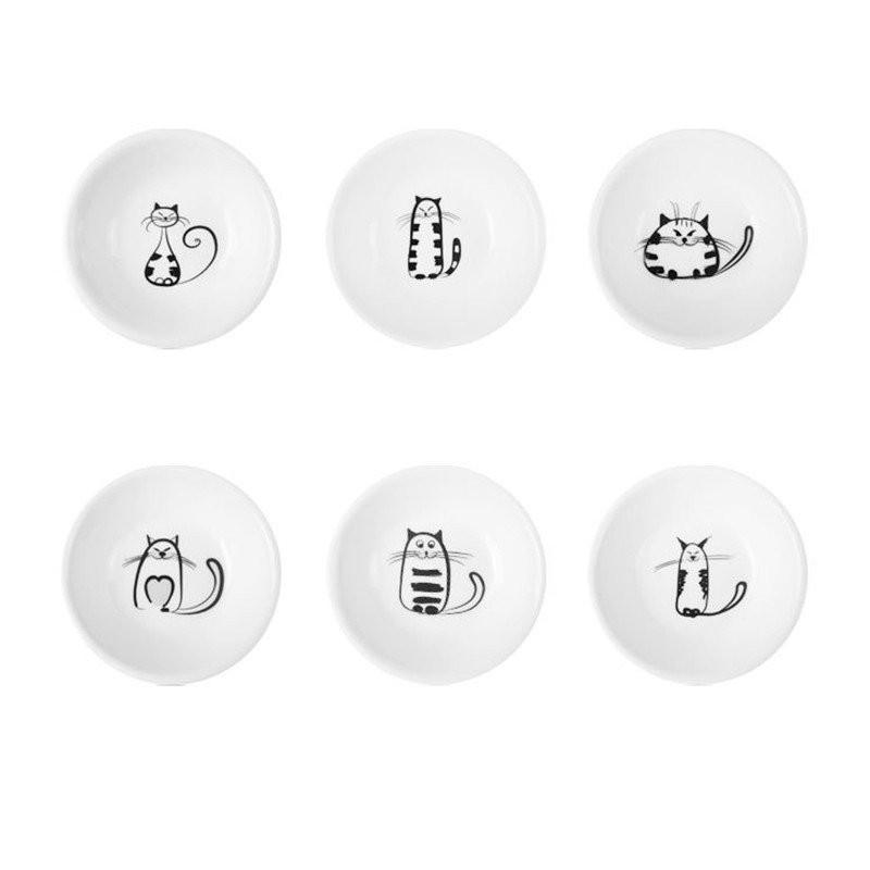These simplistic black and white yet sublime looking Tiny Cute Cat Plates come in a set of 6 pieces. You see all motives on the pictures. They will spice up your kitchen, your dinner and whatever table you put them on. The material they are made of is high-quality porcelain.