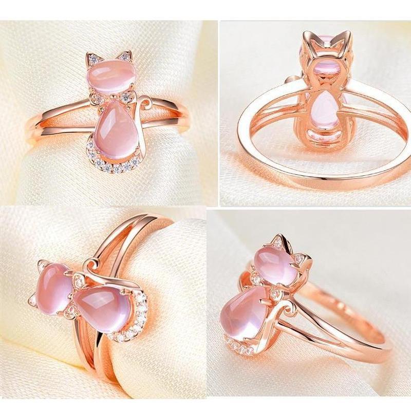 Pink Quartz Crystal Rose Gold Plated Rhinestone Cat Ring