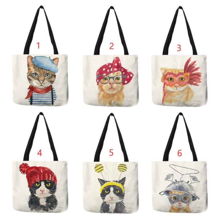 ARTFUL CAT PRINT COTTON LINEN TOTE BAG