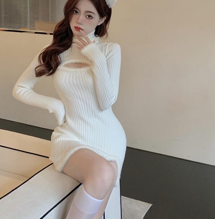 Fuzzy Long Sleeve Hollow Out Knitted Dress