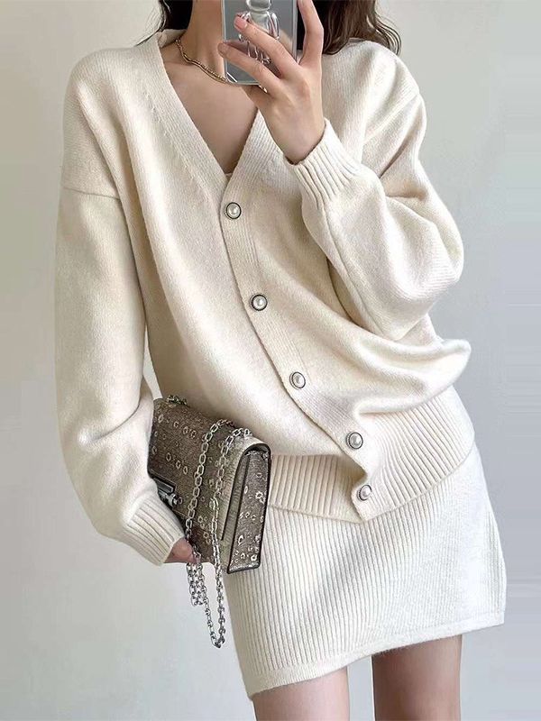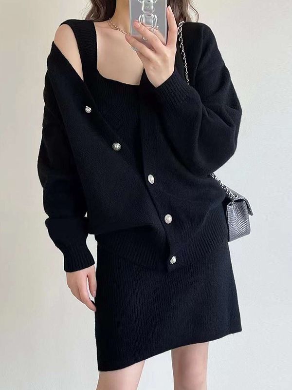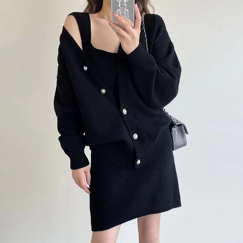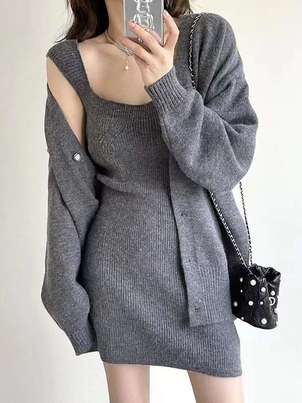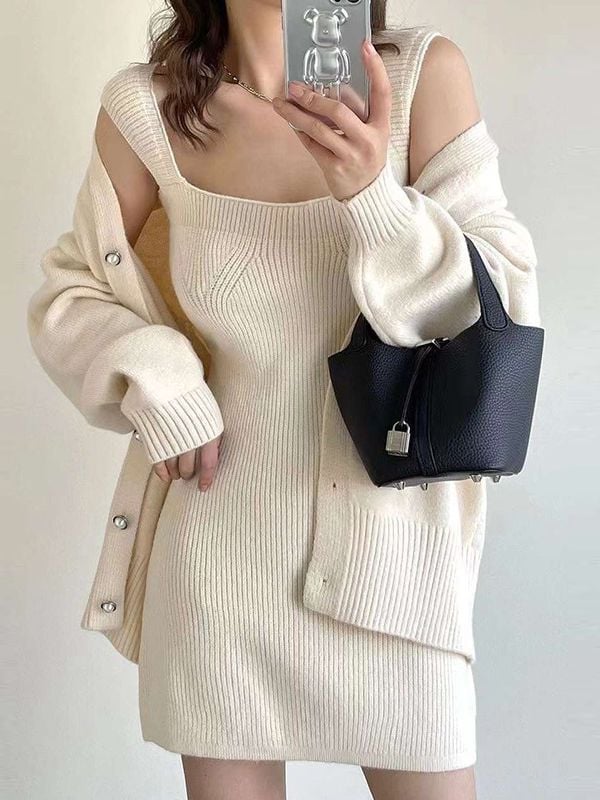 Color: Gray Suit, Off-white Set, Black Suit Size: One Size Fits All Cardigan: shoulder width 49 cm, length 60 cm, chest circumference 98 cm, sleeve length 43cm Slip dress: length 79cm bust 76-90cm