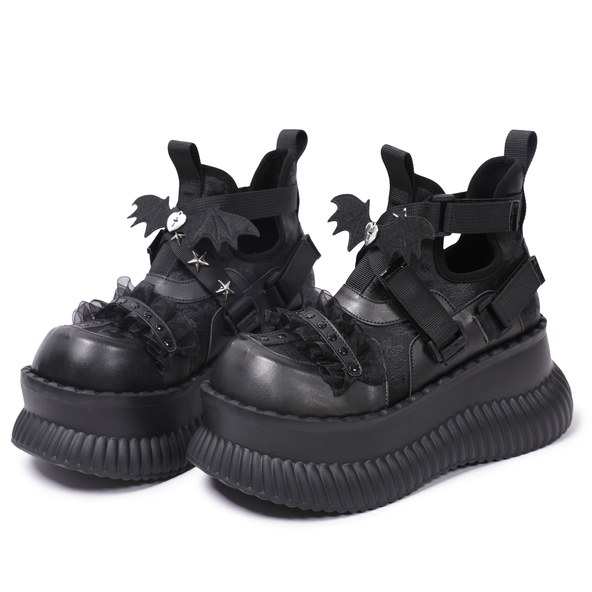 Elevate your style with our Black Lacy Bat Wing Platform Shoes. These unique shoes feature intricate lace detailing and striking bat wing accents, perfect for adding a touch of gothic elegance to any outfit. The sturdy platform design ensures comfort and durability, making them ideal for both casual and formal occasions.