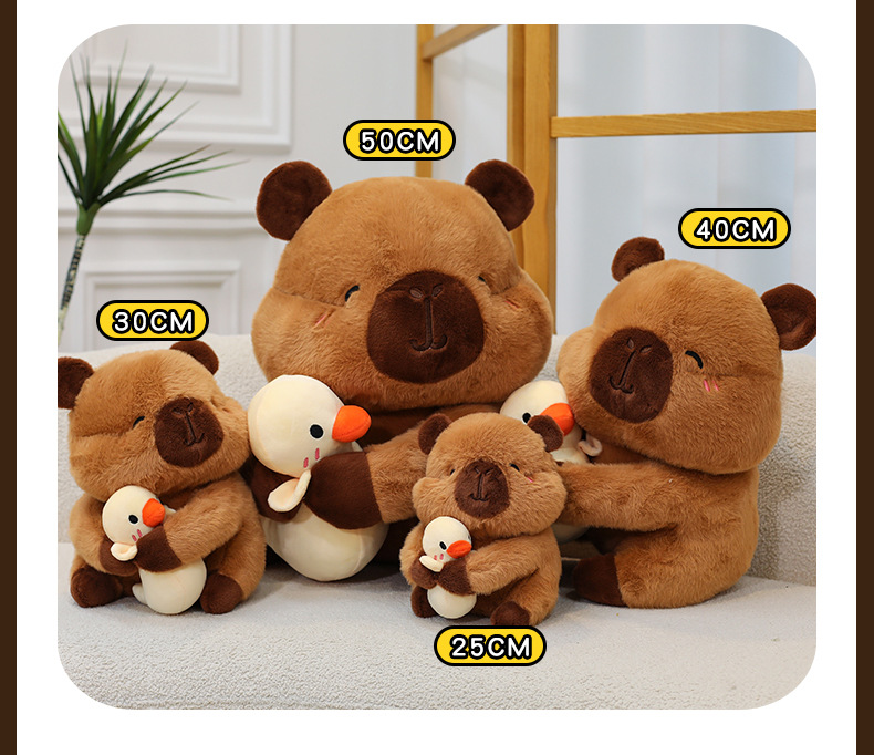 Snuggle up with our adorably unique Cute Capybara Plush Toy! This irresistibly soft capybara is captured in a heartwarming embrace with its little yellow duck doll friend. Crafted with premium, huggable materials, it's perfect for comforting cuddles and playful companionship. This charming duo brings a touch of whimsy to any space and makes a delightful gift for capybara and animal lovers of all ages. Bring home this sweet pair and let the cuddles begin!