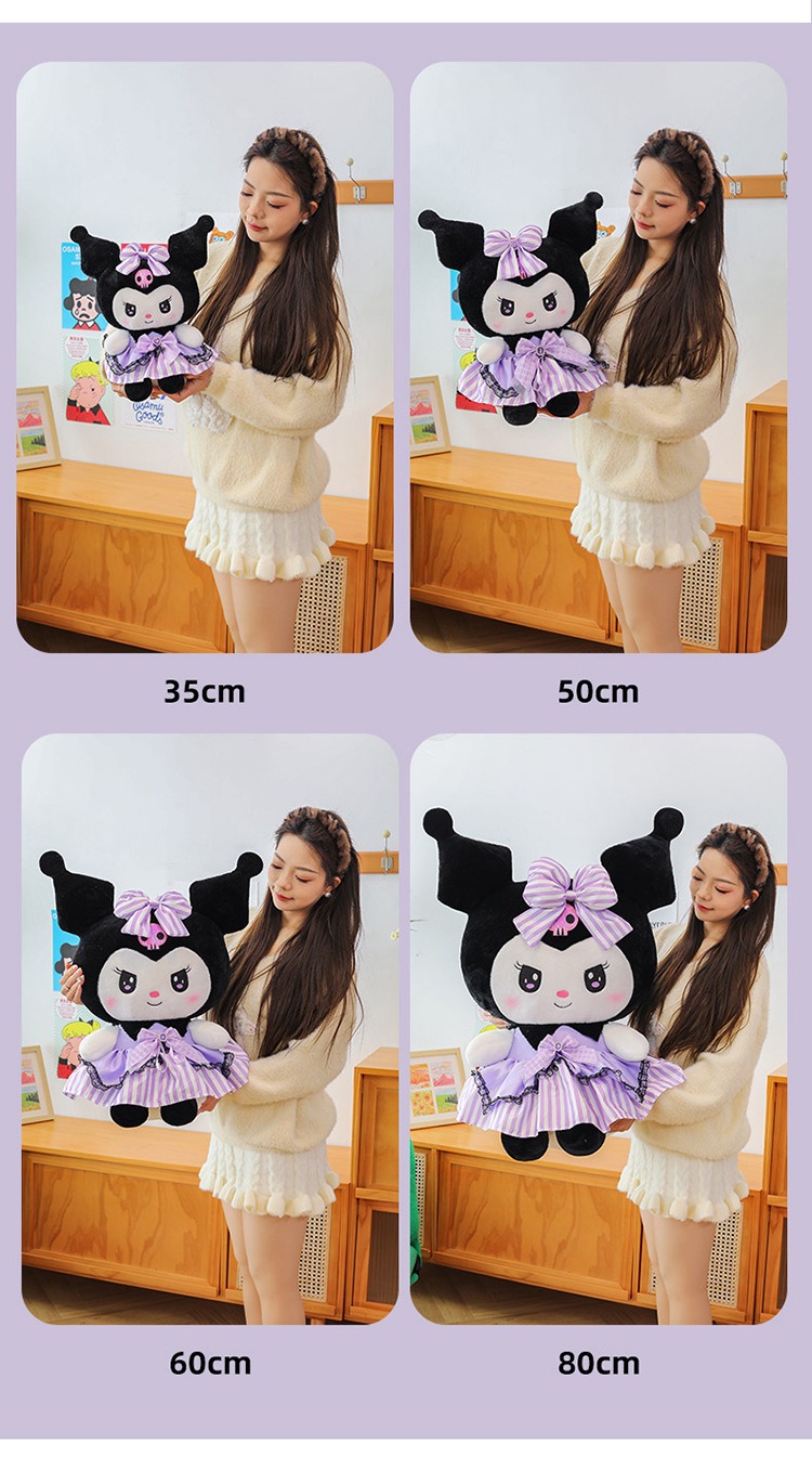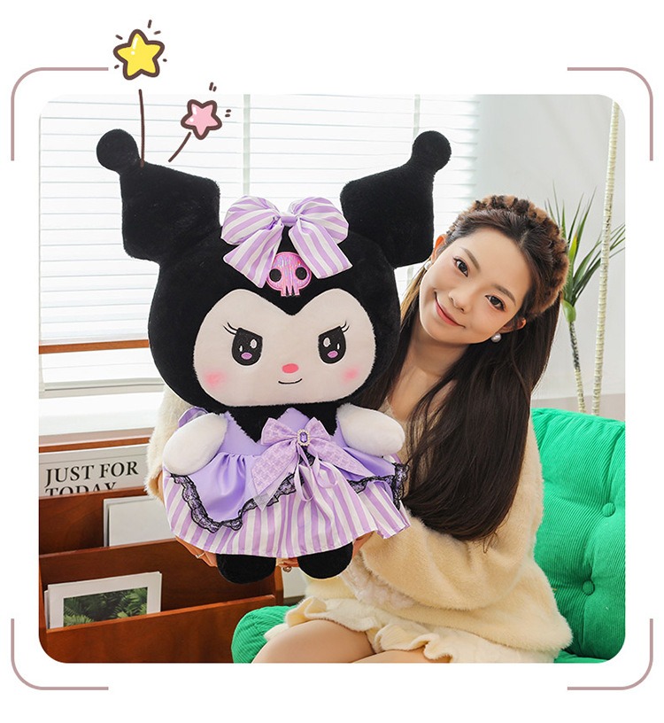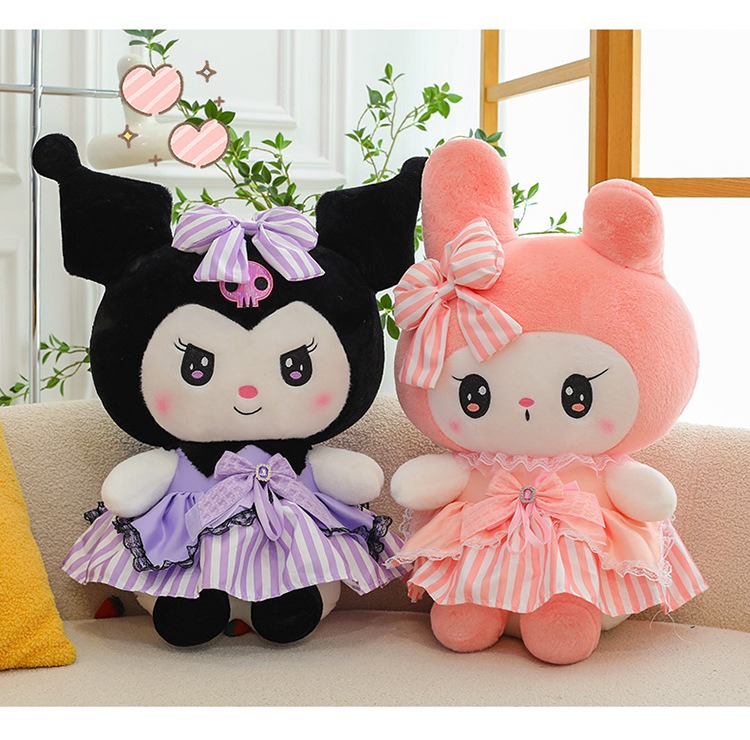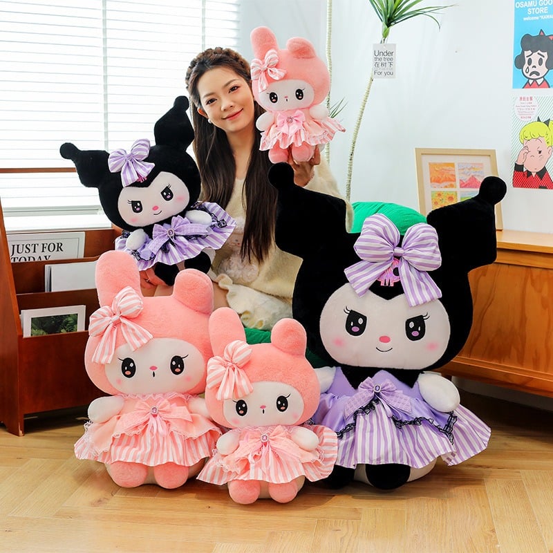 Get ready for endless cuteness with our Kawaii Dress Up Kuromi Melody Plushie! This adorable plush toy features either Kuromi or My Melody, dressed in a super cute stripe dress and matching stripe bowknot. Made with incredibly soft material, it's perfect for snuggling, displaying, or taking on all your adventures. A must-have for any fan of these iconic Sanrio characters, this plushie brings a touch of playful charm to your collection.