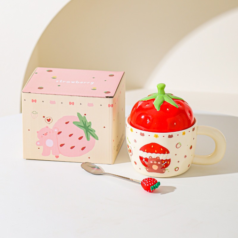 Meet your new favorite mug! Our Strawberry Bear Mug is an adorable way to enjoy your drinks. This charming ceramic mug comes with a delightful lid to keep your beverages warm and a matching spoon for easy stirring. Featuring a sweet strawberry and bear design, it adds a touch of whimsy to your kitchen. Perfect for coffee, tea, or hot chocolate, it's a delightful treat for yourself or a thoughtful gift for any bear or strawberry lover.